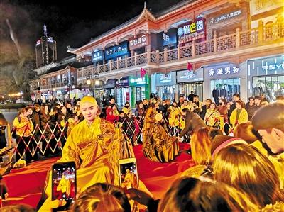 當(dāng)晚7時(shí)許,途經(jīng)表演現(xiàn)場(chǎng)的人流從四面八方聚攏于此,人們頻頻舉起手機(jī)將鏡頭對(duì)向眼前裙袂飛揚(yáng)、舞姿優(yōu)美的“大地灣女神”和頷首微笑、靜若處子的“東方微笑”,一時(shí)間,閃光燈忽明忽暗此起彼伏,行人你來我往人聲鼎沸,步行街頃刻間歡聲笑語(yǔ)、熱鬧非凡。記者發(fā)現(xiàn),扮作“不倒翁”的“女神”模仿大地灣出土的人頭瓶外部特征,而一旁采用懸浮藝術(shù)呈現(xiàn)的“小沙彌”,打禪靜坐、頷首微笑。