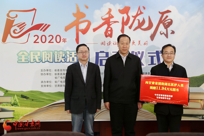啟動(dòng)儀式上,省委宣傳部副部長(zhǎng)、省新聞出版(版權(quán))局局長(zhǎng)王成勇宣布2020年“書香隴原”全民閱讀活動(dòng)正式啟動(dòng)。省委宣傳部聯(lián)合讀者集團(tuán)新華書店飛天傳媒股份有限公司通過(guò)省衛(wèi)生健康委,向全省796名支援湖北醫(yī)護(hù)人員贈(zèng)送了價(jià)值11.94萬(wàn)元的圖書。省內(nèi)10家出版社的相關(guān)負(fù)責(zé)人通過(guò)中國(guó)甘肅網(wǎng)現(xiàn)場(chǎng)直播為現(xiàn)場(chǎng)嘉賓、廣大網(wǎng)友推介優(yōu)秀甘版圖書。