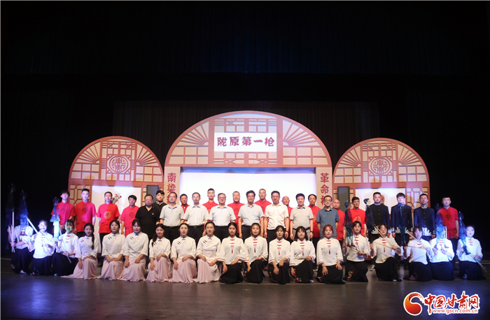 《隴原第一槍》全劇分希望、播火、誆宴、奪槍、功捷5場,演出團(tuán)隊(duì)分為前臺演唱組、樂隊(duì)伴奏組、影人挑纖組、嘛簧幫唱組,演職人員中有國家級非遺代表性傳承人2人,省級非遺代表性傳承人2人,市級、縣級代表性傳承人近10人,加上隴東音樂學(xué)院學(xué)生共50人參與了演出。