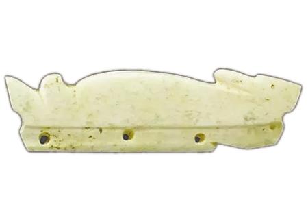 目前所見(jiàn)最早的玉兔有安徽含山凌家灘遺址出土的兔形飾件,其屬于凌家灘文化,距今5300年。該玉料受沁呈黃白色,飾件由兔形的上部和榫形的下部組成,兔呈伏臥狀,但無(wú)足部表現(xiàn),嘴前伸,耳朵向后伸,背部呈弧形上凸,尾巴既似兔子又若魚(yú),上翹分叉;榫部長(zhǎng)條形,上面對(duì)鉆成四孔。
