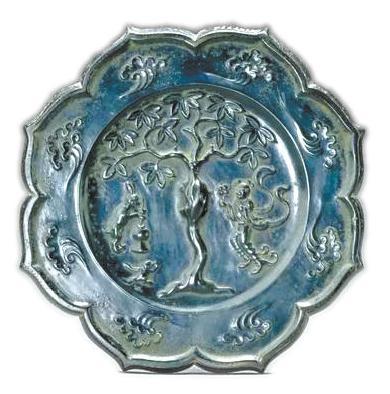 除此以外,以兔為紋的文物也很常見(jiàn)。藏于故宮博物院的唐代八瓣菱花形月宮鏡頗有特色。由于唐以前銅鏡多為圓形或方形,唐代才開(kāi)始流行花式鏡,因此,菱花形為其中最具特色者。其背面內(nèi)區(qū)下凹,紋飾凸雕月宮圖,中央為枝繁葉茂的桂樹(shù),樹(shù)干中部隆起鏤空為鏡鈕。一側(cè)為嫦娥振袖起舞,另一側(cè)為白兔搗藥,下有蟾蜍做跳躍狀。
