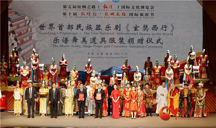 演出結(jié)束后,現(xiàn)場舉行了簡潔而隆重的“大型民族器樂劇《玄奘西行》樂譜舞美道具服裝捐贈(zèng)儀式”,中央民族樂團(tuán)將價(jià)值360萬元的樂譜、舞美、道具和服裝捐贈(zèng)給甘肅演藝集團(tuán)歌舞劇院,并指導(dǎo)甘肅省文藝院團(tuán)將民族器樂劇《玄奘西行》打造成為弘揚(yáng)絲路精神、推動(dòng)絲路文化交流融合的經(jīng)典劇目。中央民族樂團(tuán)作為海內(nèi)外規(guī)模最大、藝術(shù)最完備的綜合性國家級(jí)民族音樂表演團(tuán)體,對(duì)甘肅文藝事業(yè)和地方樂團(tuán)創(chuàng)作發(fā)展和人才培養(yǎng)給予大力支持,為甘肅文藝事業(yè)發(fā)展做出了重大貢獻(xiàn)。