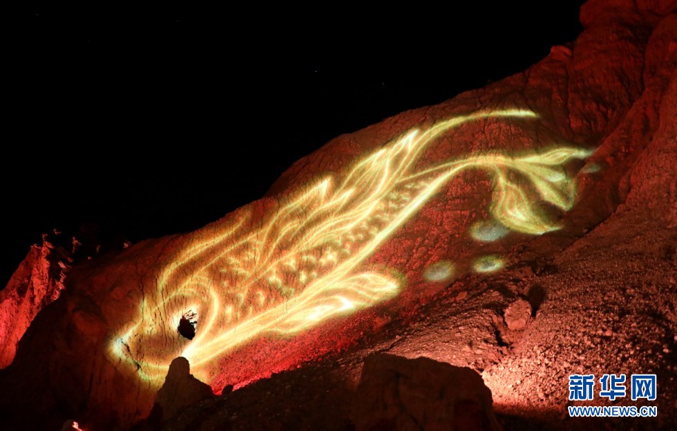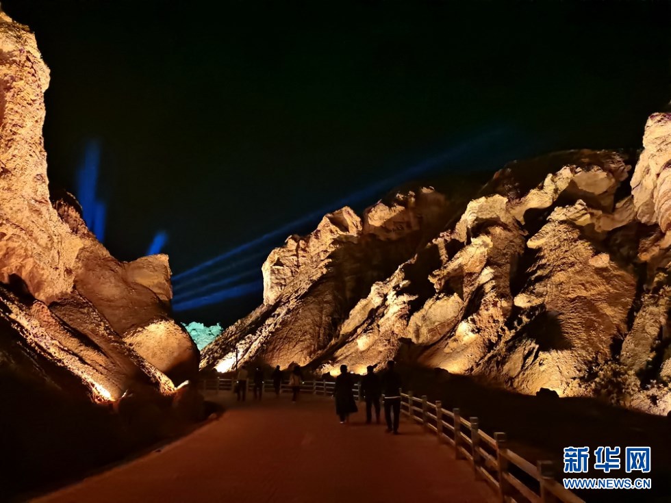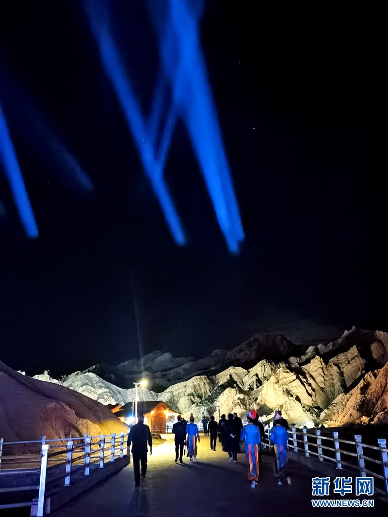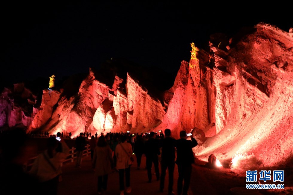七彩丹霞與燈光秀融合,呈現(xiàn)了一場(chǎng)精彩紛呈的視覺盛宴。新華網(wǎng)發(fā)(王生元 攝)