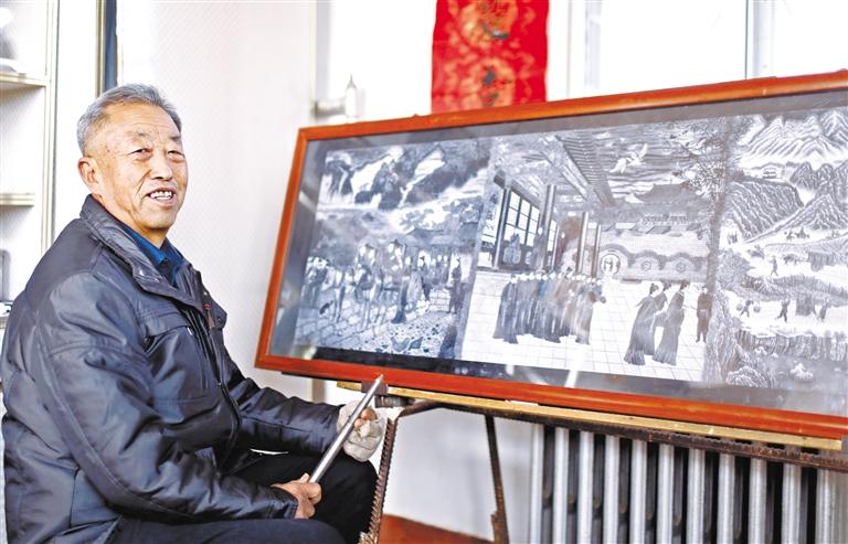 接下來就是耗費工時與體力的制作過程,“每天創(chuàng)作雕刻都在三四個小時,每分鐘在刻板的敲擊次數(shù)達到近200次,每小時敲擊次數(shù)達到8000-12000次,9大板塊在創(chuàng)作過程中就要敲擊近16億次點,每個板塊耗時10-11個月,9大板塊共耗時3000多天。”陶世清細數(shù)著創(chuàng)作的艱辛。