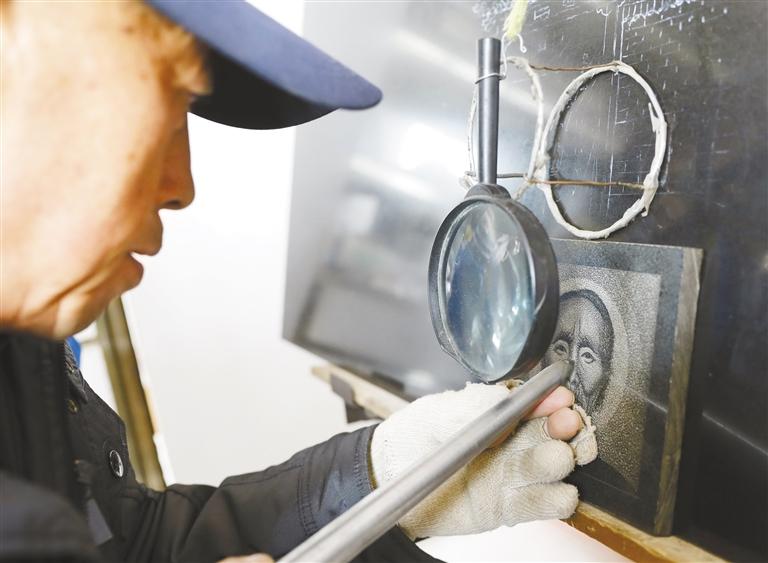 在大理石板上雕刻,是傳統(tǒng)手工技藝影雕的一種。這種雕刻方式采用墨玉、山西黑等純色石材,經(jīng)過水磨拋光后,在磨光面上要把雕琢的圖像輪廓描繪出來,根據(jù)黑白明暗成像原理,用特制的像針一樣細小的合金鋼頭工具,通過運用腕力調(diào)節(jié)針點疏密粗細、深淺和虛實線變化而表現(xiàn)圖像。