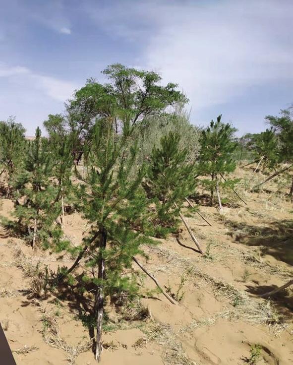 我和同伴撲進(jìn)沙海柔軟的懷抱。認(rèn)識到,再小的沙粒,也不能與塵世隔絕,我與沙,結(jié)緣于此。沙海里,一沙一世界。黃沙大膽赤裸地暴露在天幕蒼芎下,以大,以小,涵納無窮。“沙沙”的足音里,印下我深深淺淺兩行腳印,宣告著浪漫與踏實(shí)的存在。我來到習(xí)近平總書記親手栽植的“五棵松”下,仰視青松,綠云葳蕤,生機(jī)勃勃??倳浀年P(guān)懷和鼓勵,黃沙熱熱地、輕輕地長出了更多綠色羽翼,這羽翼在不斷地生長壯大,有“代代相傳”的精神,綠色終究會覆蓋全部騰格里。捧起一捧黃沙,細(xì)沙像嬰兒肌膚般的柔滑,我試圖用臉貼近它,這些黃色的小精靈,從我指縫間輕盈地流淌到松下,似乎在暗示我,要把自己的夢筑進(jìn)治沙精神的瀚海里??茖W(xué)家們已作出結(jié)論:沙漠是人類最后的寶地,別看它現(xiàn)在荒蕪,它里面蘊(yùn)藏著無盡的寶藏和財富。