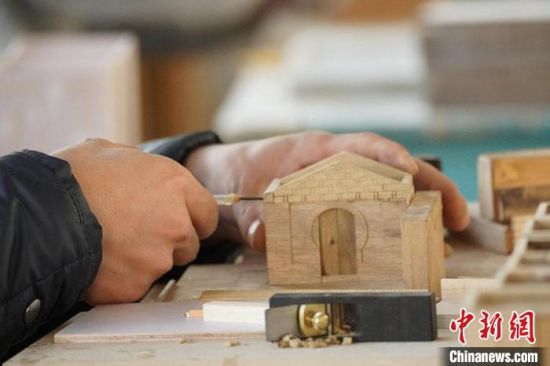 圖為古建筑模型工作室內(nèi)工作人員正在制作模型?!【琶赖┰?nbsp; 攝