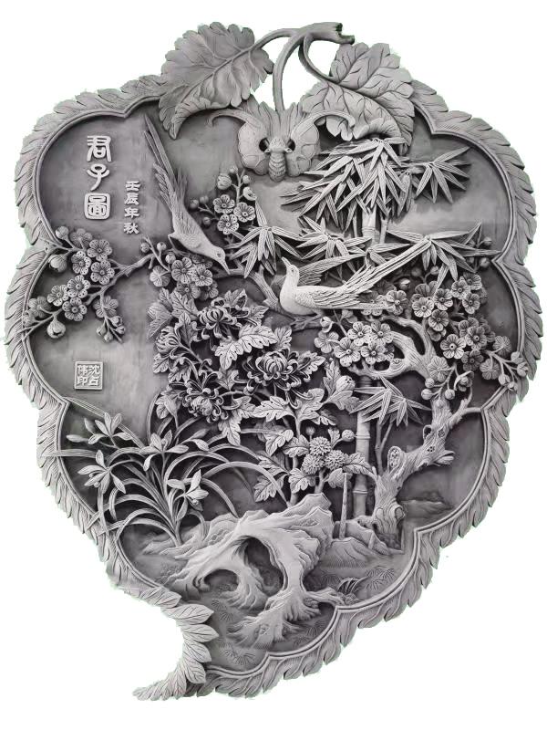 端詳沈占偉的作品,有栩栩如生的花鳥(niǎo),大氣磅礴的山川,活靈活現(xiàn)的人物,能想到的體裁應(yīng)有盡有。可以說(shuō)遠(yuǎn)看端莊大氣,近看細(xì)節(jié)精湛,尤其是對(duì)動(dòng)植物的刻畫,仿佛通過(guò)他的刻刀賦予了生命,在原本冰冷的磚塊上呼之欲出,生機(jī)勃勃。難能可貴的是,他并不會(huì)限制自己的創(chuàng)作體裁,每一幅作品都是匠心之作,都傾盡了他的心血。