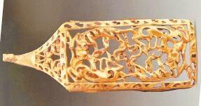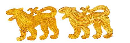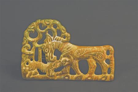 受草原文化影響,虎的造型更具藝術(shù)性,形式亦豐富多彩。甘肅省博物館藏的西周虎紋耳形銅鉞,整體似半環(huán),鑄猛虎紋,虎背為刃。尾下有短胡兩穿,尾、雙爪上鑄凹槽,虎首下彎,張口含銎,露牙睜目,領(lǐng)內(nèi)有一圓形穿孔。甘肅省文物考古研究所藏的戰(zhàn)國金帶鉤,鉤首為長頸龍首狀,頸部為三棱狀,肩部三角形邊框內(nèi)鏤空雕鑄對稱和狼形圖案。鉤身為長方形,邊框內(nèi)鏤空雕刻一組正反相對稱的虎噬大角羊圖案。張家川回族自治縣博物館藏的戰(zhàn)國晚期的虎形金飾片,虎尖耳上翹,大嘴張開,鬃毛卷曲上翹,尾前卷于背部與鬃毛相連,四足著地做行走狀,栩栩如生地展現(xiàn)了虎行走的動(dòng)感之態(tài)。甘肅省博物館藏的戰(zhàn)國虎噬羊紋金飾片,虎張口露齒,垂首蹲踞,虎口銜羊,前爪按住羊肩部,后爪抓住羊臀部,羊四肢跪地作掙扎狀,活靈活現(xiàn)地展現(xiàn)出猛虎捕食羊的瞬間動(dòng)態(tài),形象逼真。這些虎文物都是此次展覽中的亮點(diǎn)。