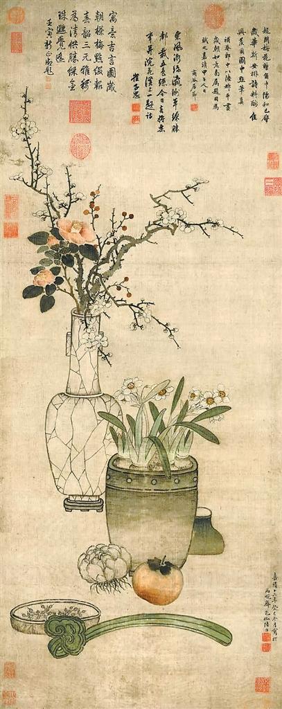 明代陸治的《歲朝圖》可以說是入門級別的標(biāo)準(zhǔn)范本。白釉冰裂紋貫耳瓶中插梅、茶、天竹,乳釘弦紋盆中植水仙。盆花前是百合、柿子、如意組成的百事如意組合,如意后方的盤中盛穗,又合作歲歲如意。