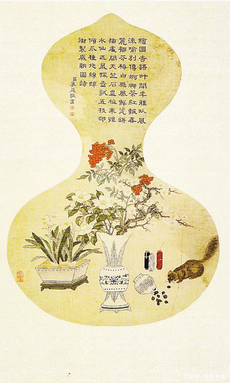 元代的《歲朝圖》中在瓶梅和水仙盆景前,描繪了一只偷堅果的小松鼠,貯果的瓷瓶被打翻,瓜子灑了一地,旁邊還有兩顆打滾的核桃。