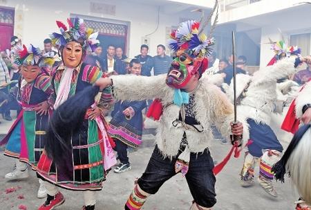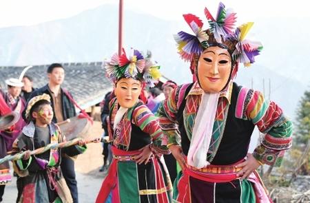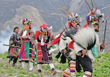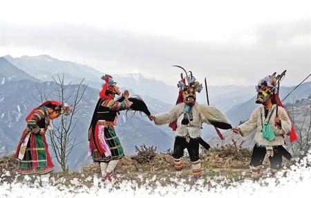 “池哥晝”是居住在文縣鐵樓鄉(xiāng)的白馬人傳承至今的一種民間舞蹈和傳統(tǒng)祭祖活動,為國家級非物質文化遺產。“池哥晝”是隴南白馬語的音譯,為山神之意,“晝”表示舞蹈。“池哥晝”因表演時頭戴面具,亦稱“白馬面具舞”。白馬人是古代仇池國白馬氐族后裔,距今有兩千多年歷史。