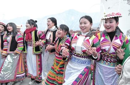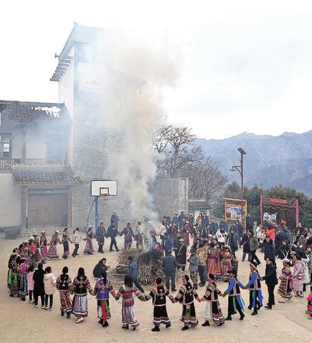 文縣鐵樓鄉(xiāng)麥貢山村,當?shù)鼐幼〉臇|亞最古老部族白馬藏族用自己獨特的民俗——跳“池哥晝”,歡度元宵佳節(jié)。
