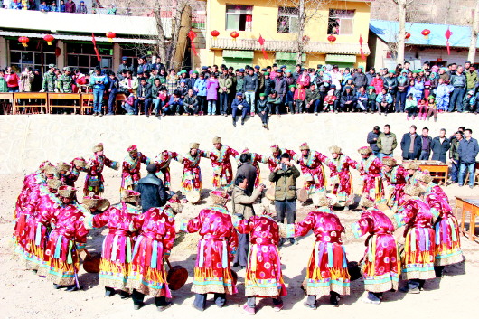 “咚、咚、咚咚咚……”“莎木、莎木、揚(yáng)莎木……”春節(jié)期間,岷縣中寨鎮(zhèn)的巴當(dāng)舞演出傳統(tǒng)節(jié)會(huì)如期舉行,在紛紛揚(yáng)揚(yáng)的漫天大雪里,巴當(dāng)激越的鼓點(diǎn)和雄壯的旋律回響在大山深處,忙碌了一年的村民又迎來(lái)了屬于他們酣暢淋漓的狂歡節(jié)。