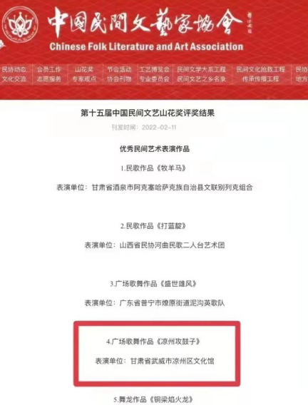 中國甘肅網(wǎng)3月14日訊(本網(wǎng)記者 張振國)近日,第十五屆中國民間文藝山花獎評獎結(jié)果公示,由武威市舞蹈家協(xié)會副主席付泓創(chuàng)作、武威市涼州區(qū)文化館表演的作品《涼州攻鼓子》榮膺該獎。該獎項(xiàng)的獲得,是武威市文藝創(chuàng)作和非遺保護(hù)傳承的又一優(yōu)秀成果。