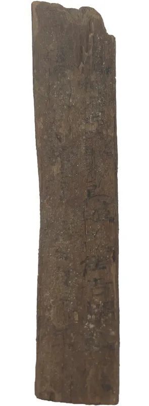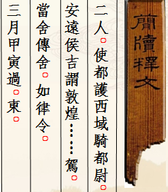 木簡1枚(出土編號:Ⅱ90DXT0213③:135),1990年出土于敦煌懸泉置遺址。長7.2、寬1.3、厚0.25厘米。木簡上殘,兩行書寫,字跡模糊,難以辨識。簡文作“二人。使都護(hù)西域騎都尉、安遠(yuǎn)侯吉謂敦煌……駕,當(dāng)舍傳舍,如律令。三月甲寅過,東。”。簡中“使都護(hù)西域騎都尉”是西域都護(hù)的正式官名,“騎都尉”當(dāng)指以本官都護(hù)西域,是其本職,而“使”則突出了使職性質(zhì)。這是懸泉置記錄的一份傳文書,簡文不完整,大意是說某年三月甲寅日,西域都護(hù)鄭吉派遣的使者自西向東行,懸泉置依傳律規(guī)定,為停駐的兩名使者提供了飲食。該簡文對研究懸泉置的傳舍制度,以及西漢王朝對西域行使管轄提供了重要的原始資料?,F(xiàn)藏甘肅簡牘博物館。