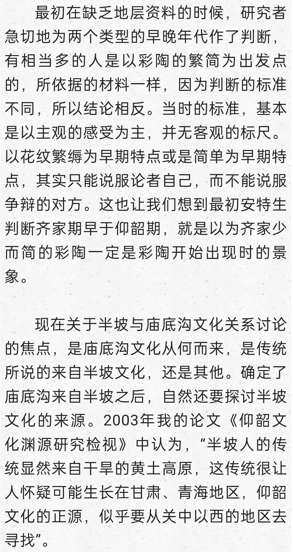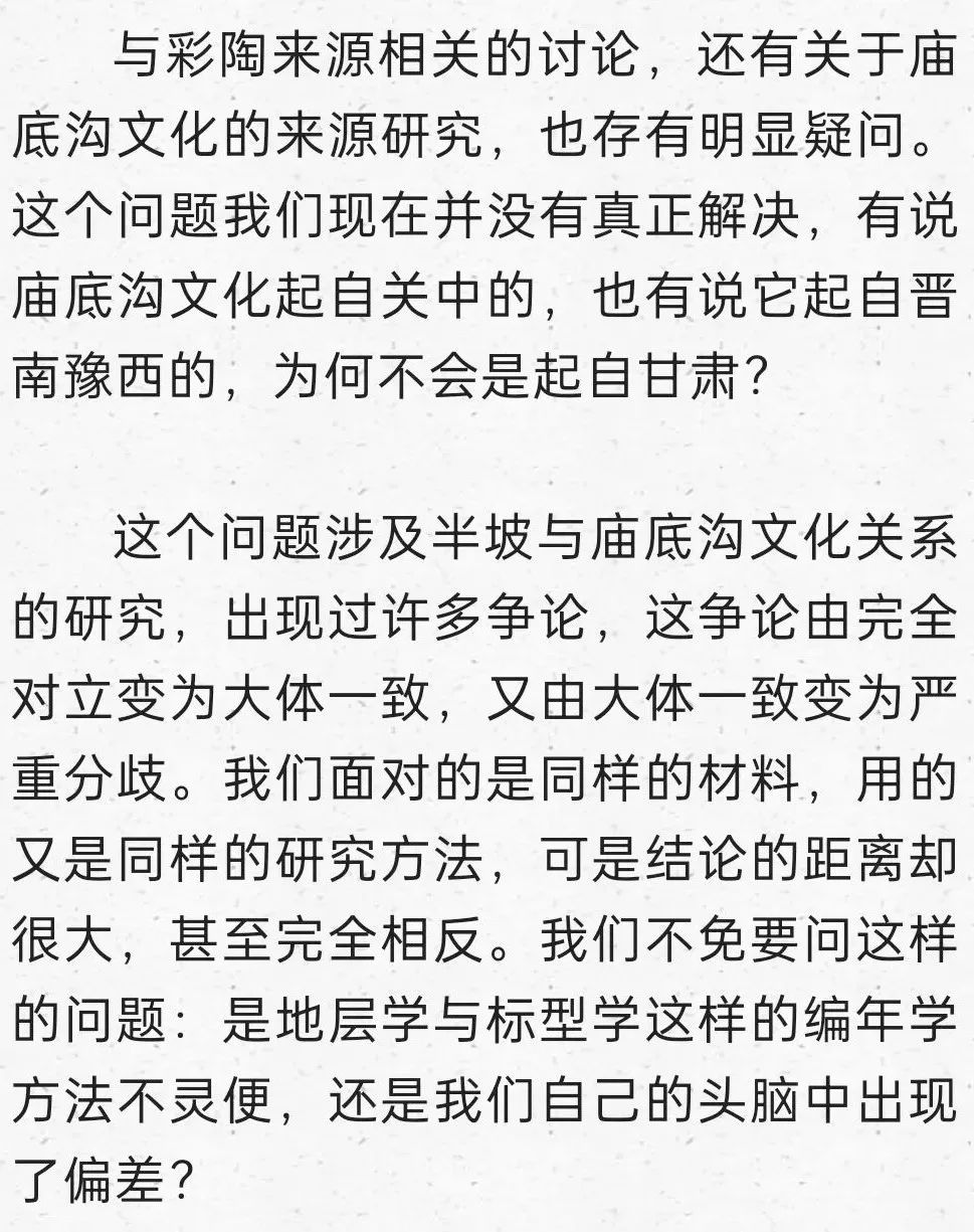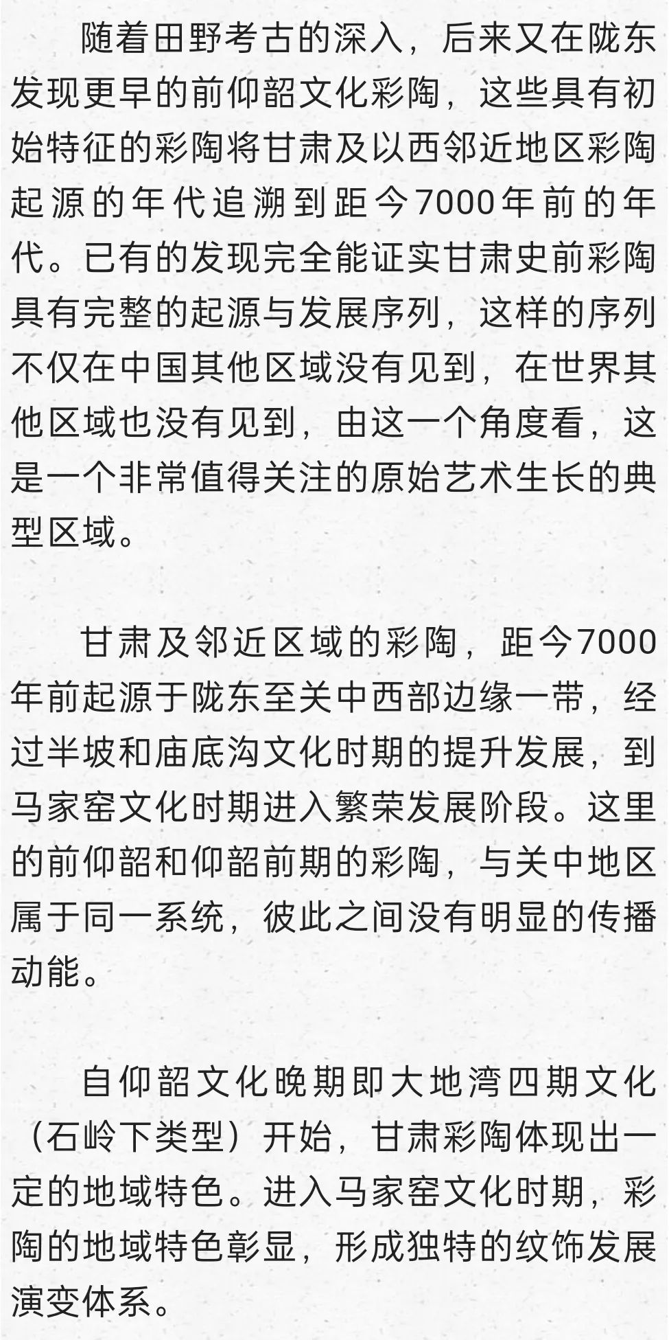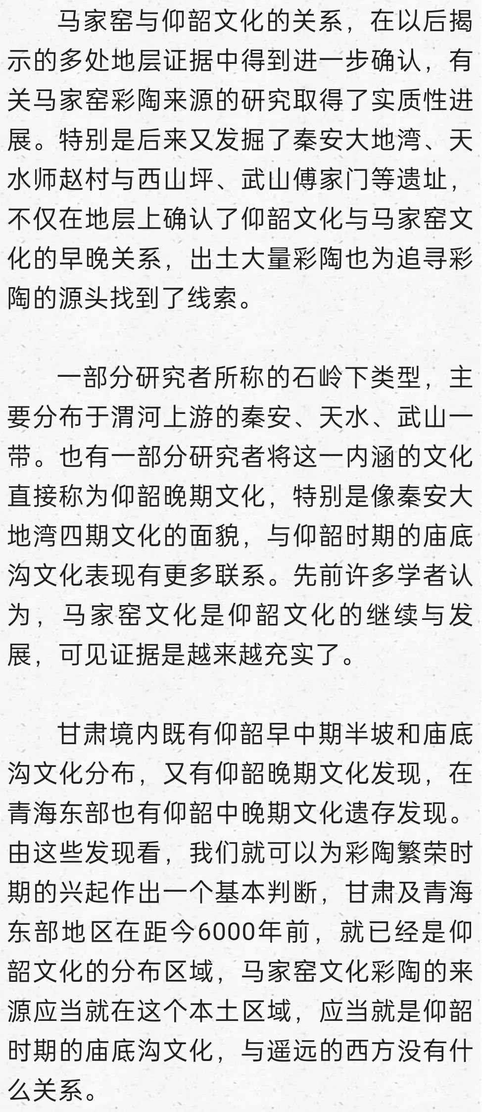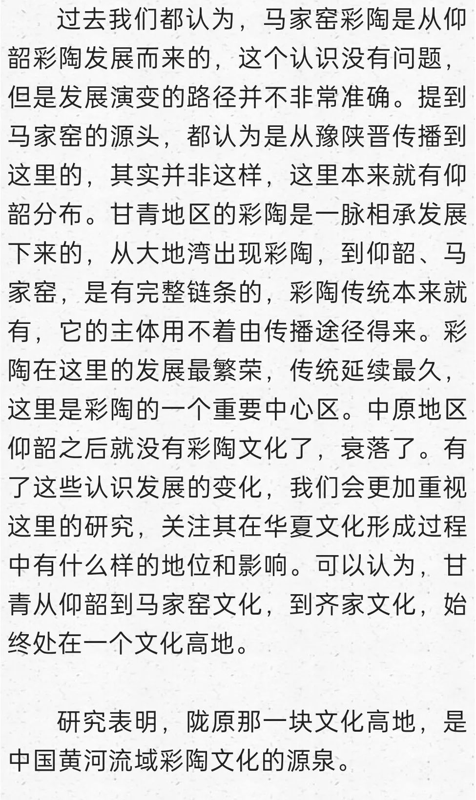 在這里明確提出到甘青尋找仰韶文化的正源,后來(lái)我又寫(xiě)成《秦安大地灣遺址彩陶研究》,討論甘青彩陶的序列,也表達(dá)了類似觀點(diǎn):“甘肅及青海東部地區(qū)在距今6000年前左右,就已經(jīng)是仰韶文化的分布區(qū)域,馬家窯文化彩陶的來(lái)源應(yīng)當(dāng)就在這個(gè)本土區(qū)域,應(yīng)當(dāng)就是仰韶時(shí)期的廟底溝文化。從文化的分布與地層堆積關(guān)系找到了甘肅地區(qū)考古學(xué)文化明確的傳承關(guān)系,由彩陶紋飾演變的考察也能尋找到傳承的脈絡(luò)”。
