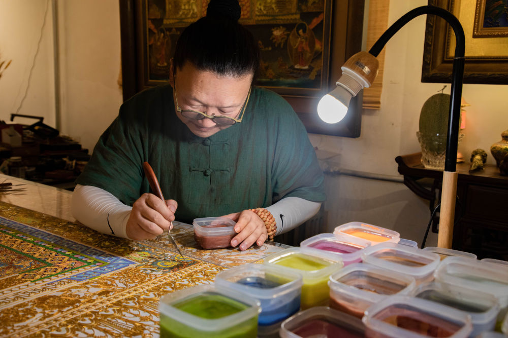 李海明在為一幅掐絲琺瑯壁畫上色。新華社記者郎兵兵攝