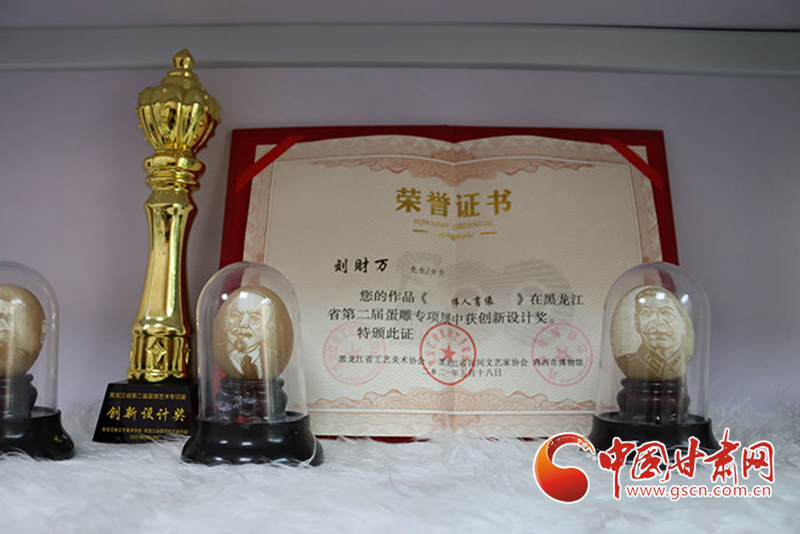 記者在采訪(fǎng)中注意到,社區(qū)的展柜一角擺放著不少獲獎(jiǎng)證書(shū),其中一張是在2021年的全國(guó)蛋雕專(zhuān)項(xiàng)展上,為劉財(cái)萬(wàn)作品《偉人肖像》頒發(fā)的創(chuàng)新設(shè)計(jì)獎(jiǎng)證書(shū)。“目前正在為全國(guó)蛋雕藝術(shù)聯(lián)展作準(zhǔn)備”,當(dāng)記者問(wèn)起下一步打算時(shí),劉財(cái)萬(wàn)顯得信心十足。