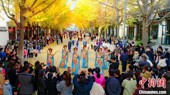 11月中下旬,在甘肅省天水市秦州區(qū)“黃金大道”上演了“絲路舞姿”,舞蹈是由秦州區(qū)文旅局組織的舞蹈隊帶來的舞蹈《絲路》《醉太平》和《萬疆》等。該路段由于216株銀杏樹的金黃色樹葉彼此參差相連,宛如兩條“黃金色帶”在道路兩側,所以被當?shù)鼐用穹Q為“黃金大道”。