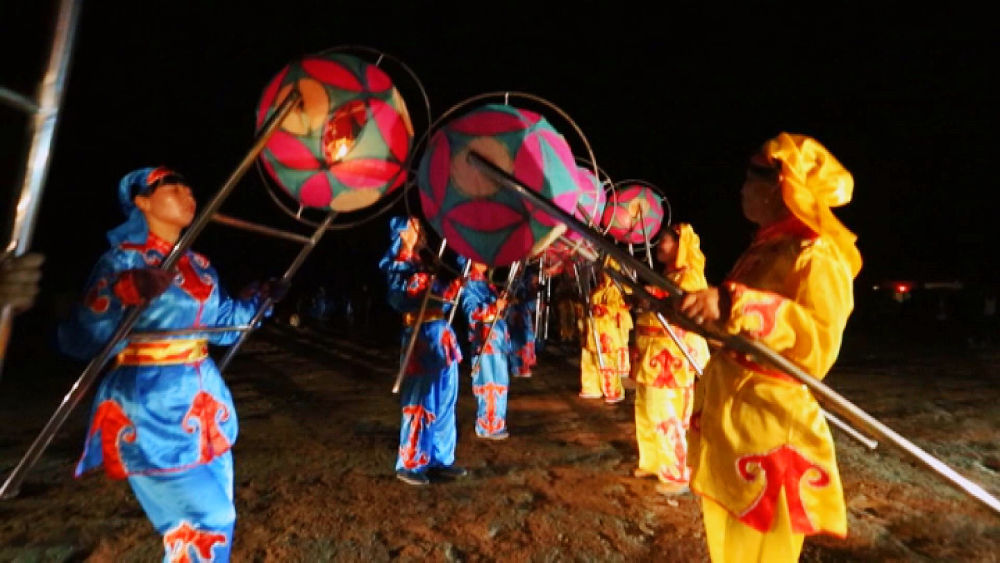 景泰滾燈由燈籠和燈架組成,燈籠分里外兩層,為圓形,外層轉(zhuǎn)動(dòng)內(nèi)層固定,燈籠外層用彩紙或紗綢裱糊。表演者手執(zhí)燈架,輕輕一碰地面,燈籠便轉(zhuǎn)動(dòng)起來。夜晚,彩燈滾動(dòng),猶若五彩斑斕的長龍,扭曲躍動(dòng),時(shí)慢時(shí)快,回頭擺尾往復(fù)盤旋,交響輝映,別有一番情趣。