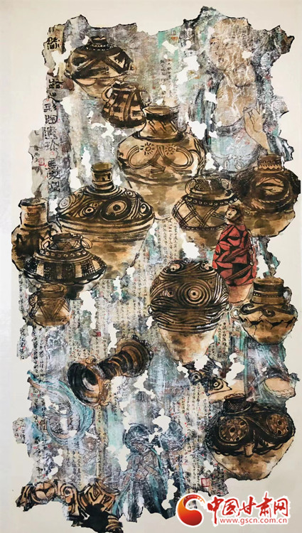 他的這幅作品《絲路遺珍-馬家窯》于2018年獲甘肅美術(shù)專業(yè)最高獎“金駝獎”,采用黃河的“s”型構(gòu)圖展開,將八千年前新石器時代大地灣文化、馬家窯文化的經(jīng)典代表器物分次展開。作品左上角及中間部分依次疊加,穿插,繪制中與敦煌文化中的壁畫、飛天、佛像有機(jī)結(jié)合,寓示絲路文化有序傳承、源遠(yuǎn)流長,又對畫面的視覺撥高提升。