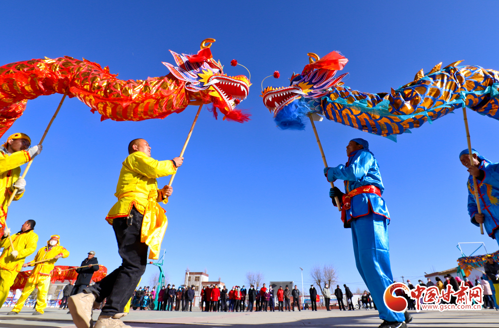 1月9日,甘肅省張掖市甘州區(qū)花寨鄉(xiāng)的社火表演隊(duì)正在文化廣場(chǎng)上加緊排練。