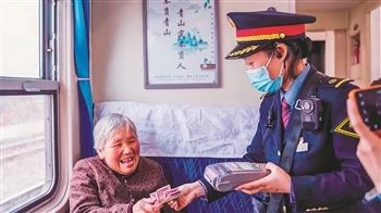 7505/7506次列車長(zhǎng)在途中為老年旅客辦理現(xiàn)金補(bǔ)票業(yè)務(wù)。強(qiáng) 科 攝