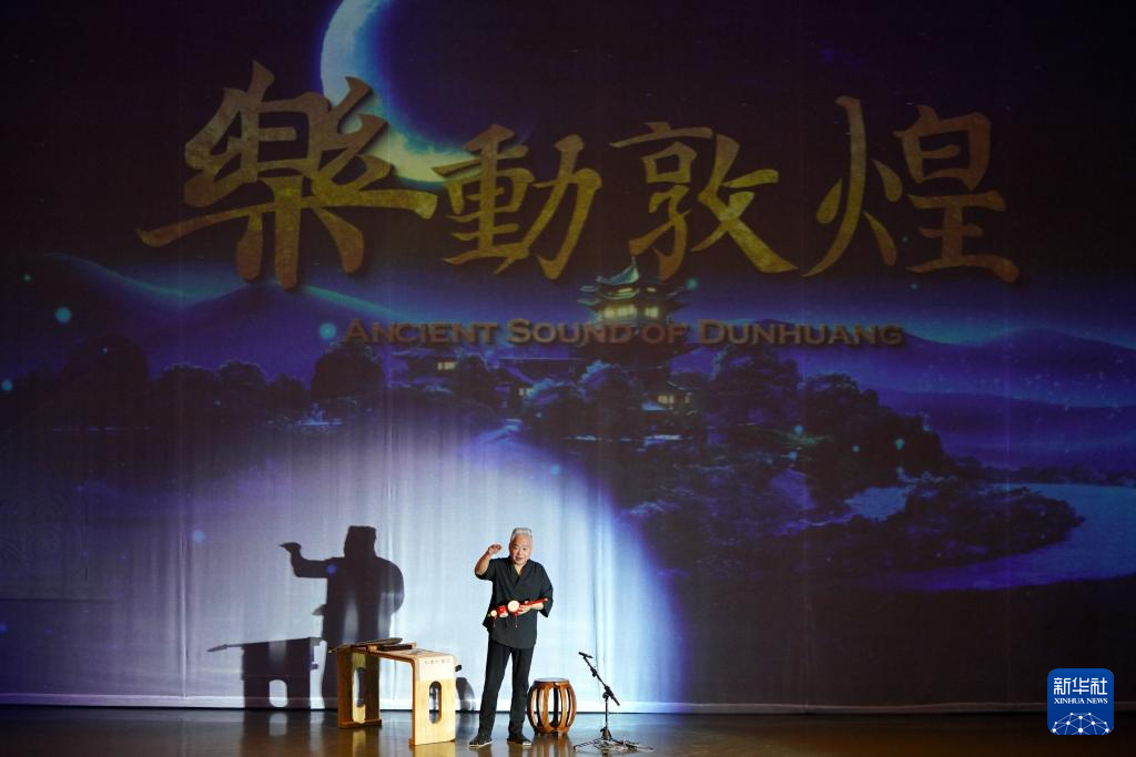 8月9日,在《樂動敦煌》演出現(xiàn)場,敦煌古樂全球推廣大使、國樂藝術(shù)家方錦龍在向觀眾介紹傳統(tǒng)音樂。新華社記者 馬寧 攝