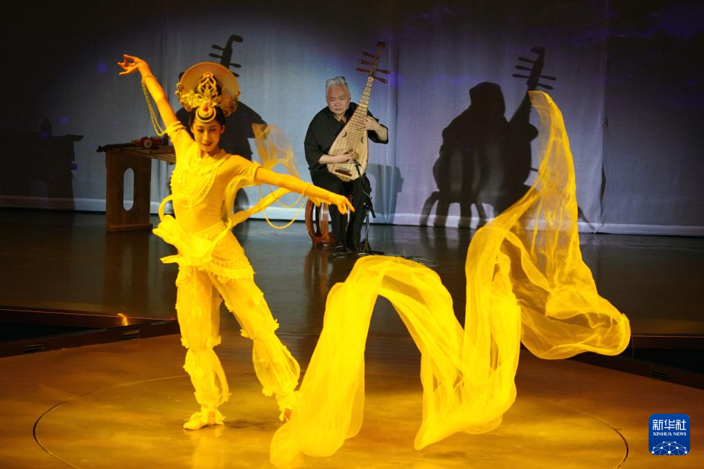 8月9日,在《樂動敦煌》演出現(xiàn)場,敦煌古樂全球推廣大使、國樂藝術(shù)家方錦龍演奏琵琶,為舞蹈演員伴奏。新華社記者 馬寧 攝