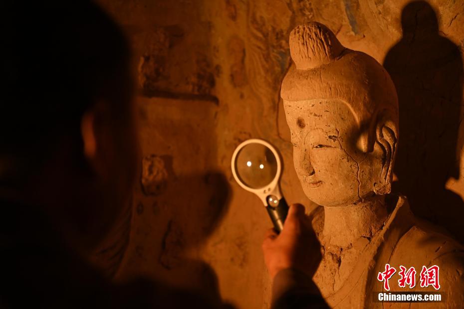 有時候看似簡單的佛像修復(fù)會遇到各類不同的文物病害,修復(fù)時間會長達三年之久,他也見證了文物修復(fù)技藝的變遷。隨著科技進步文物修復(fù)手段也變得越來越先進,他認為未來的文物保護工作一定會越來越好,年輕文保工作者們也一定會想盡更多辦法留住這座世界文化遺產(chǎn)。圖為8月25日,文物修復(fù)師牟常有正在仔細觀察佛像表面出現(xiàn)的病害問題。李亞龍 攝