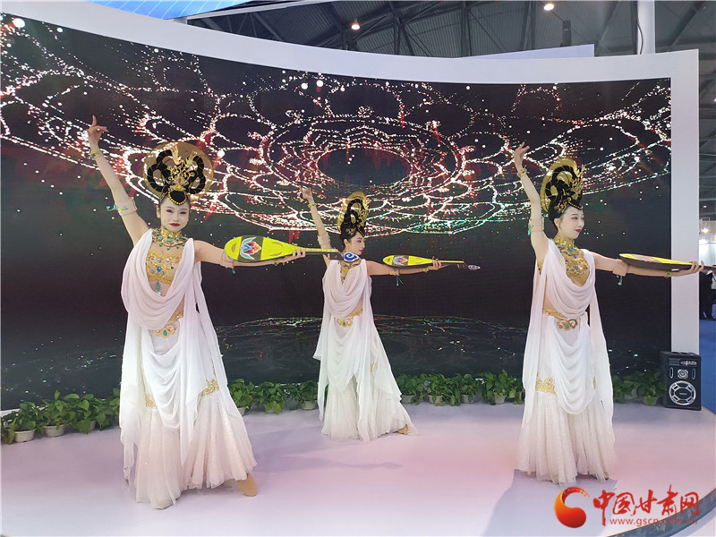 走進(jìn)甘肅特色版權(quán)館,敦煌文化元素濃郁。無論是展廳頂部的三兔共耳藻井,還是數(shù)字敦煌展區(qū)顯眼現(xiàn)代的四個(gè)大字,都在展示甘肅的敦煌元素。而展廳舞臺(tái)區(qū)更是以數(shù)字敦煌庫為背景,由舞蹈演員現(xiàn)場(chǎng)表演《妙音反彈》,讓觀眾走進(jìn)甘肅館,就能發(fā)現(xiàn)敦煌韻。