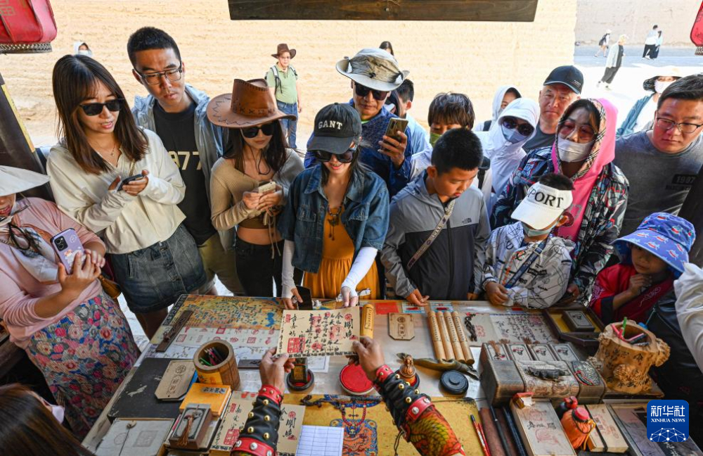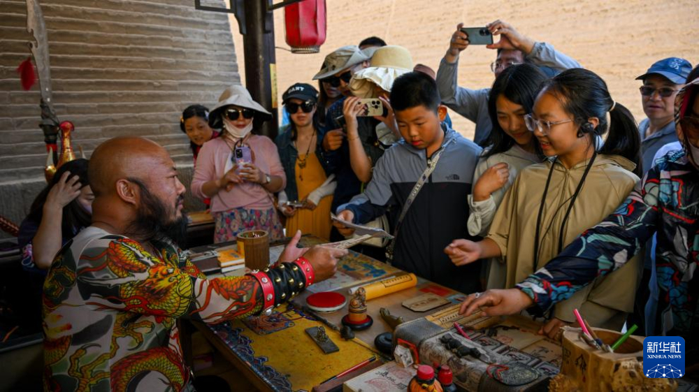 7月14日,在甘肅嘉峪關(guān)關(guān)城景區(qū),游客在李森的攤位前等待他“簽發(fā)關(guān)照”。新華社記者 陳鐘昊 攝