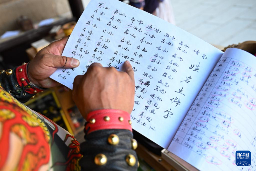 在甘肅嘉峪關(guān)關(guān)城景區(qū),李森在攤位上查閱自己編寫的含有生僻字讀音、城市古地名等內(nèi)容的小冊(cè)子(7月14日攝)。新華社記者 陳鐘昊 攝