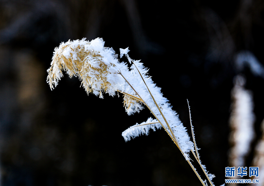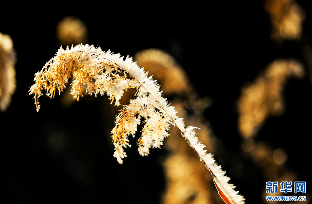冬日里,甘肅省張掖國(guó)家濕地公園蘆葦叢中的蘆花掛滿冰花,晶瑩剔透,美不勝收。新華網(wǎng)發(fā)(陳禮 攝)