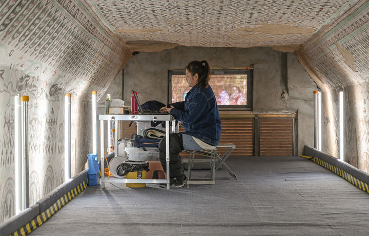 2023年8月3日,在敦煌莫高窟正在保護修繕的第55窟內,一位文保工作者對采集的數(shù)據(jù)進行整理。新華每日電訊記者 李賀 攝