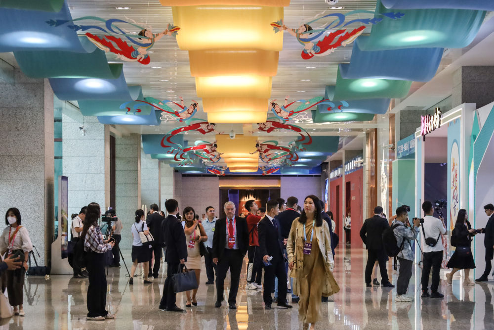 2023年9月6日,與會嘉賓在第六屆絲綢之路(敦煌)國際文化博覽會上參觀。新華社記者 馬希平 攝