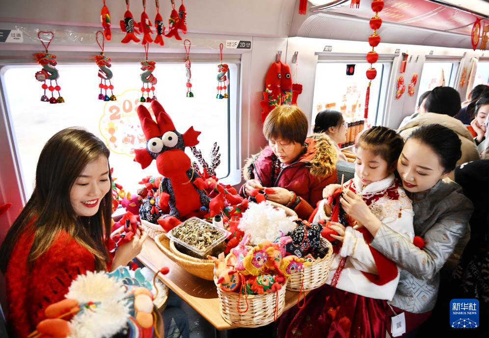 當(dāng)日,中國鐵路濟(jì)南局集團(tuán)有限公司青島客運(yùn)段在齊魯環(huán)游線G6955次列車上開展“年俗非遺進(jìn)高鐵”活動(dòng),讓旅客在旅途中感受傳統(tǒng)文化的魅力,營造濃郁的節(jié)日氛圍。
