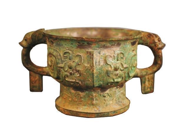 器物保存完整,紋飾十分講究,造型圖案十分精美,為國家一級文物。通高14.6厘米,口徑19厘米,底徑14.3厘米。鑄造工藝在西周時(shí)期屬于較為上乘之作。夔紋是圖騰紋飾,《說文》中云:“夔如龍而一足。”簋的兩邊為耳,呈環(huán)狀。上部各有一變形的龍首,顯得十分莊重、大氣。整個器物周身布滿綠銹,脫銹之處露出青銅光澤,透出歷史的厚重之美。
