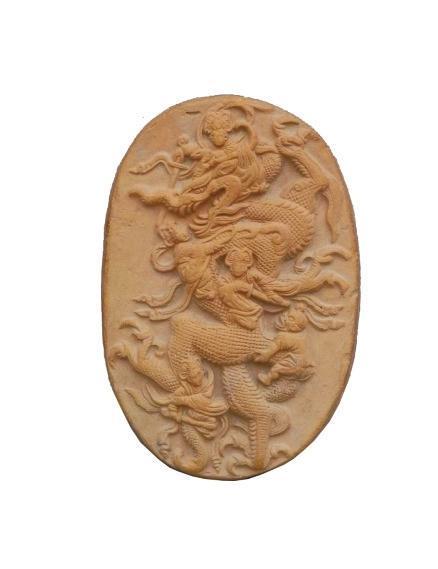 1990年出土于莊浪縣水洛鎮(zhèn)寺坪塬遺址。高11.7厘米,寬7.9厘米,厚1.5厘米,呈橢圓形。泥質(zhì)紅陶,背面平素。畫面表現(xiàn)的是某神話故事,正面飾淺浮雕紋飾,正中為一巨龍張牙舞爪、怒目圓睜、奮力騰空,一女神左手緊抓龍角,右手持劍欲砍龍首;龍頸部有一女神拿繩索套縛,另一女神在龍胸部作拔劍狀;一力士則用力拽龍尾,凸目張嘴,聲色驚恐萬分;在龍的后肢旁還有一女神右手握劍砍殺。五神皆神態(tài)各異,造型逼真,生動表現(xiàn)了五神伏龍時(shí)驚心動魄的場景。