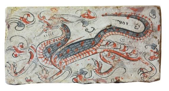 磚面上龍的形象棱角分明,骨架清瘦。龍身前屈后伸,起伏轉(zhuǎn)折,龍首高昂,張口吟嘯。前肢呈登騰狀,后肢做行進(jìn)狀。鬣鬃飛揚(yáng),揚(yáng)爪攪尾,四爪如鷙,整條龍動態(tài)十足,形象逼真,為五代時(shí)期模印花磚中的精品。