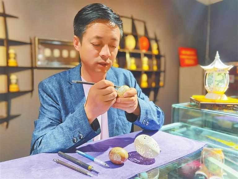 蛋雕改變了楊星國的生活,也改變了他對(duì)人生的追求。源于蛋雕藝術(shù)品呈現(xiàn)的精妙,慕名拜訪他的人很多,去他的工作室參觀或?qū)W習(xí),并向他請(qǐng)教問題時(shí),他都會(huì)細(xì)致、耐心地講解或演示,有時(shí)候還會(huì)讓游客自己上手體驗(yàn)。
