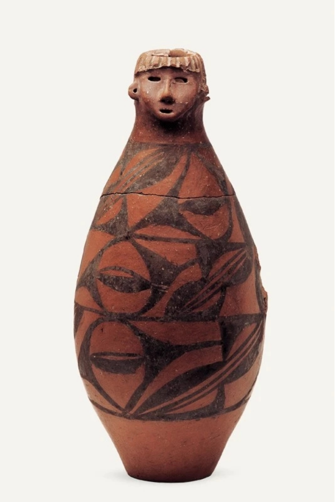 隴東少女作為甘肅的“顯眼包”之一,是曾在《國家寶藏》中出現(xiàn)過的“網(wǎng)紅”、甘肅省博物館鎮(zhèn)館之寶,它于1973年從秦安縣大地灣遺址出土。具有高度審美能力的“托尼”老師,設(shè)計(jì)了齊劉海發(fā)型,顯得很泰酷辣,圓鼓腹、平底,人們細(xì)看發(fā)現(xiàn),陶人的兩眼為圓孔洞,顯得目光深邃;鼻子呈蒜頭形,雕有鼻孔;嘴較小,微微張開,好像正在言語;兩耳外展,皆有穿孔;瓶體從上至下以黑彩飾三層大小相同、由弧線三角紋和斜線組成的二方連續(xù)圖案,以示華麗的衣物。另外,陶瓶人頭像的器口運(yùn)用了不同的制作手法,頭發(fā)、嘴系雕刻而成,鼻、臉是捏塑而成。人頭像五官整齊、面龐秀麗,器身造型典雅,與人物形象渾然一體,既是大地灣文化彩陶的代表作,也是中國史前集彩繪、雕塑與造型藝術(shù)于一身的杰作。估計(jì)任誰看一眼,都會(huì)被“她”的神秘和美麗所吸引吧。