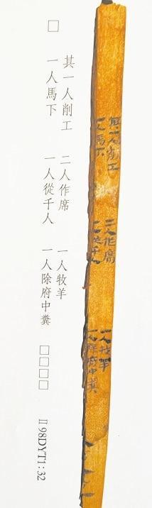 簡7是都尉府戍卒日作簿,戍卒分工簡明清楚。“削工”用紅柳、胡楊木削制簡牘。作席,疏勒河沿岸生長著大量芨芨草、蘆葦,戍卒用來編制席笆,用于防潮御寒。疏勒河沿岸水草豐茂,適宜放牧。“一人牧羊”可知,養(yǎng)牛、羊供都尉府吏員食用。“一人馬下”,由于缺當(dāng)時(shí)的語言環(huán)境,釋義模糊。千人是都尉府中級(jí)軍官職務(wù)。除府中糞,清除廁所糞便。