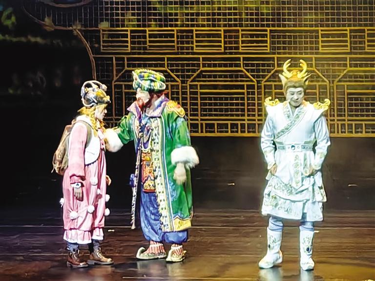 演出現(xiàn)場,大美敦煌被搬到舞臺(tái)上,星云變幻間,時(shí)空在劇場轉(zhuǎn)換,鹿鳴、莉娜、巴巴亞穿梭在沙漠、月牙泉和莫高窟、敦煌市集之間,與“先知”對(duì)話,向神仙請(qǐng)教,與沙塵暴斗爭,根據(jù)蛛絲馬跡尋找3件天宮樂器的下落。