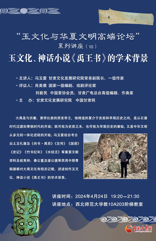 4月24日晚,馮玉雷講座“玉文化、神話小說《禹王書》的學(xué)術(shù)背景”在西北師范大學(xué)舉辦。這次講座是甘肅文化發(fā)展研究院和中國甘肅網(wǎng)聯(lián)合舉辦的“玉文化玉華夏文明高端論壇”系列講座第十講,也是近期啟動(dòng)的“巡禮馬銜山:玉文化與文學(xué)融合發(fā)展”系列活動(dòng)之一,甘肅文化發(fā)展研究院常務(wù)副院長(zhǎng)、一級(jí)作家馮玉雷主講,國家一級(jí)編劇、戲劇評(píng)論家肖美鹿,中國音協(xié)會(huì)員、甘肅廣電總臺(tái)高級(jí)編輯、作曲家劉新民擔(dān)綱學(xué)術(shù)評(píng)議嘉賓。