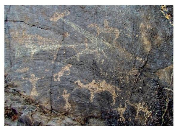 黑山巖畫全稱為“黑山摩崖淺石刻巖畫”,分布于嘉峪關西北約 10—20公里處的黑山峽谷陡崖峭壁上,為遠古時期黑山地區(qū)游牧民族生產(chǎn)、生活的真實記錄?,F(xiàn)共發(fā)現(xiàn)分布在黑山石關峽口、磨子溝、蕉蒿溝、四道股形溝、紅柳溝、交河溝六處戰(zhàn)國至明代時期的巖畫,共 157 幅。黑山巖畫反映的時限跨度大,時空關系復雜,涉及部族較多。畫面所反映的內(nèi)容豐富多彩,有動物、人物、佛塔、植物等,還有大型的操練舞蹈場景。涉及人類學、社會學、歷史學、考古學、美術學、生物學、地理學等多個學科,具有較高的研究價值。