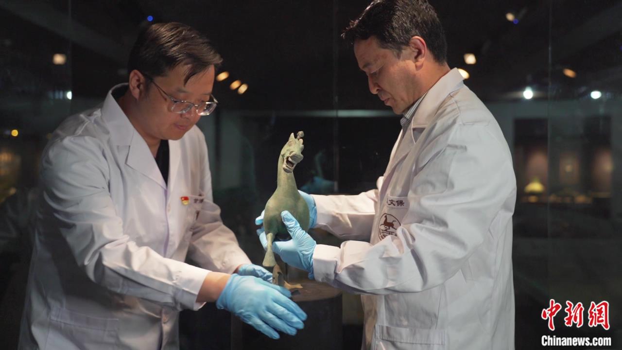 甘肅省博物館文物保護(hù)修復(fù)中心主任、副研究館員張東(左)與同事在工作中。受訪者 供圖