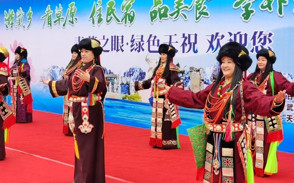 在天祝縣抓喜秀龍阿尼嘎卓帳篷城,身著藏族服飾的美麗卓瑪向采風(fēng)團(tuán)獻(xiàn)上了潔白的哈達(dá),華銳藏歌、華銳則柔、華銳鍋莊等獨(dú)具特色的文藝演出讓現(xiàn)場(chǎng)觀眾拍手稱贊。