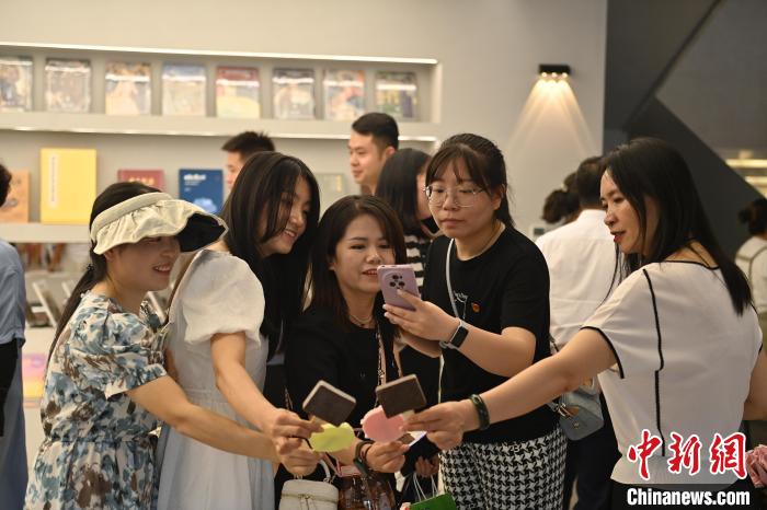 6月19日,甘肅省博物館藝術(shù)生活館在甘肅蘭州開館。該館是甘肅省博物館打造的一處復合型高價值文化空間,融合了咖啡、烘焙、展覽、藝術(shù)書店、文創(chuàng)銷售等多樣化業(yè)態(tài)。圖為顧客與自己挑選的蘭州凍梨文創(chuàng)玩偶合影。中新社記者 李亞龍 攝